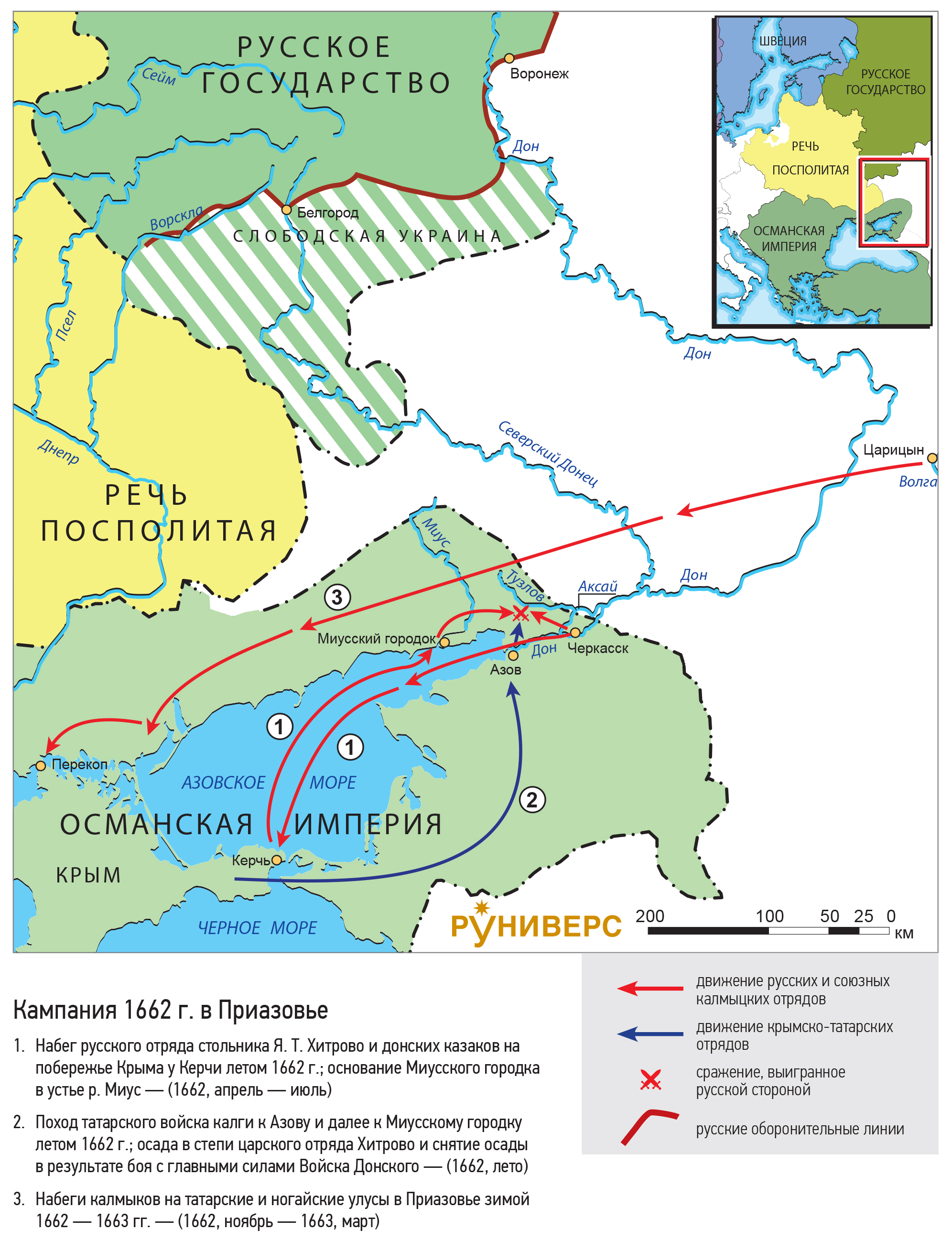 1. Набег русского отряда стольника Я. Т. Хитрово и донских казаков на побережье Крыма у Керчи летом 1662 г.; основание Миусского городка в устье р. Миус — (1662, апрель — июль)