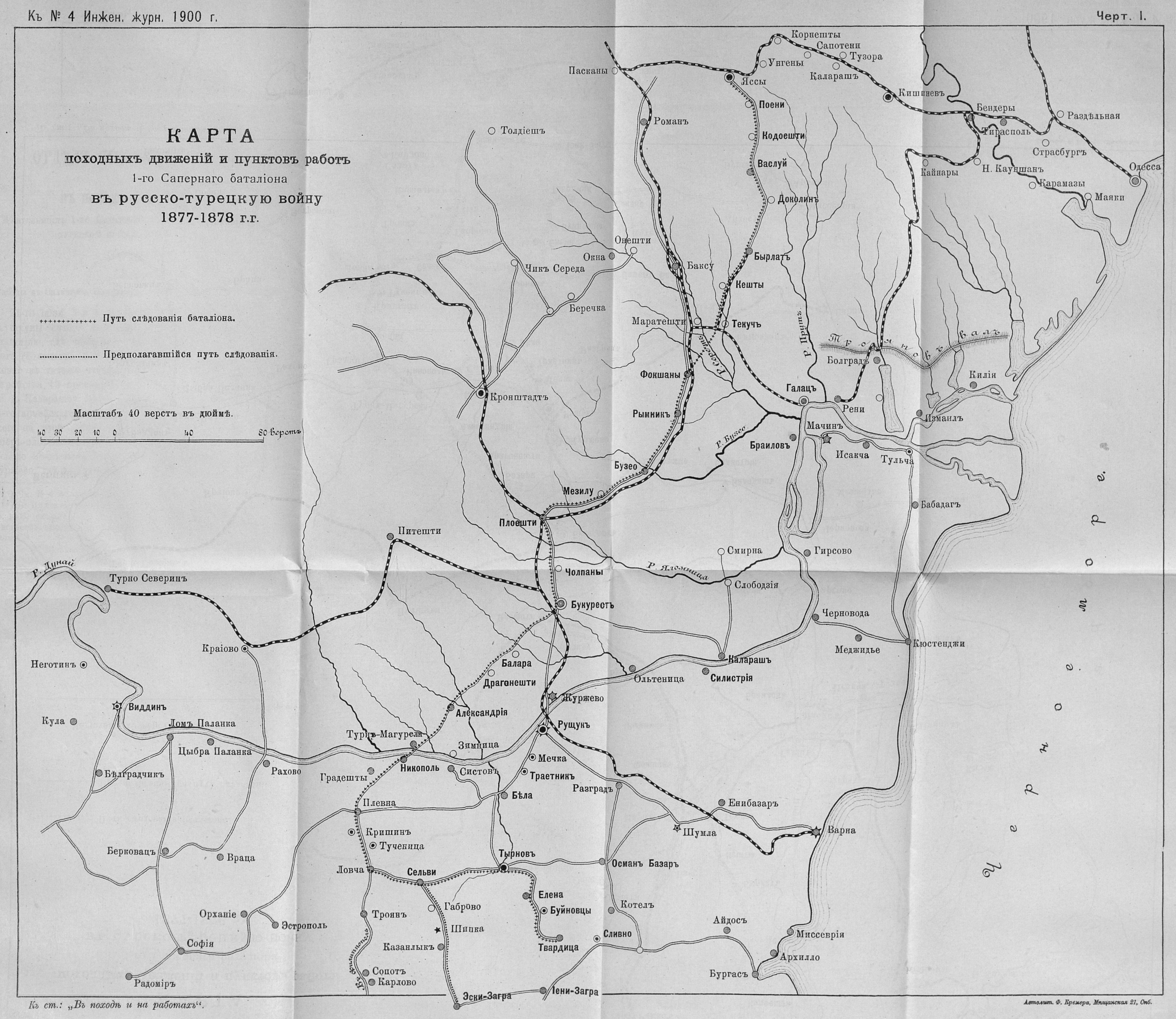 Карта походных движений и пунктов работ 1-го Саперного батальона в русско-турецкую войну 1877-1878 годов