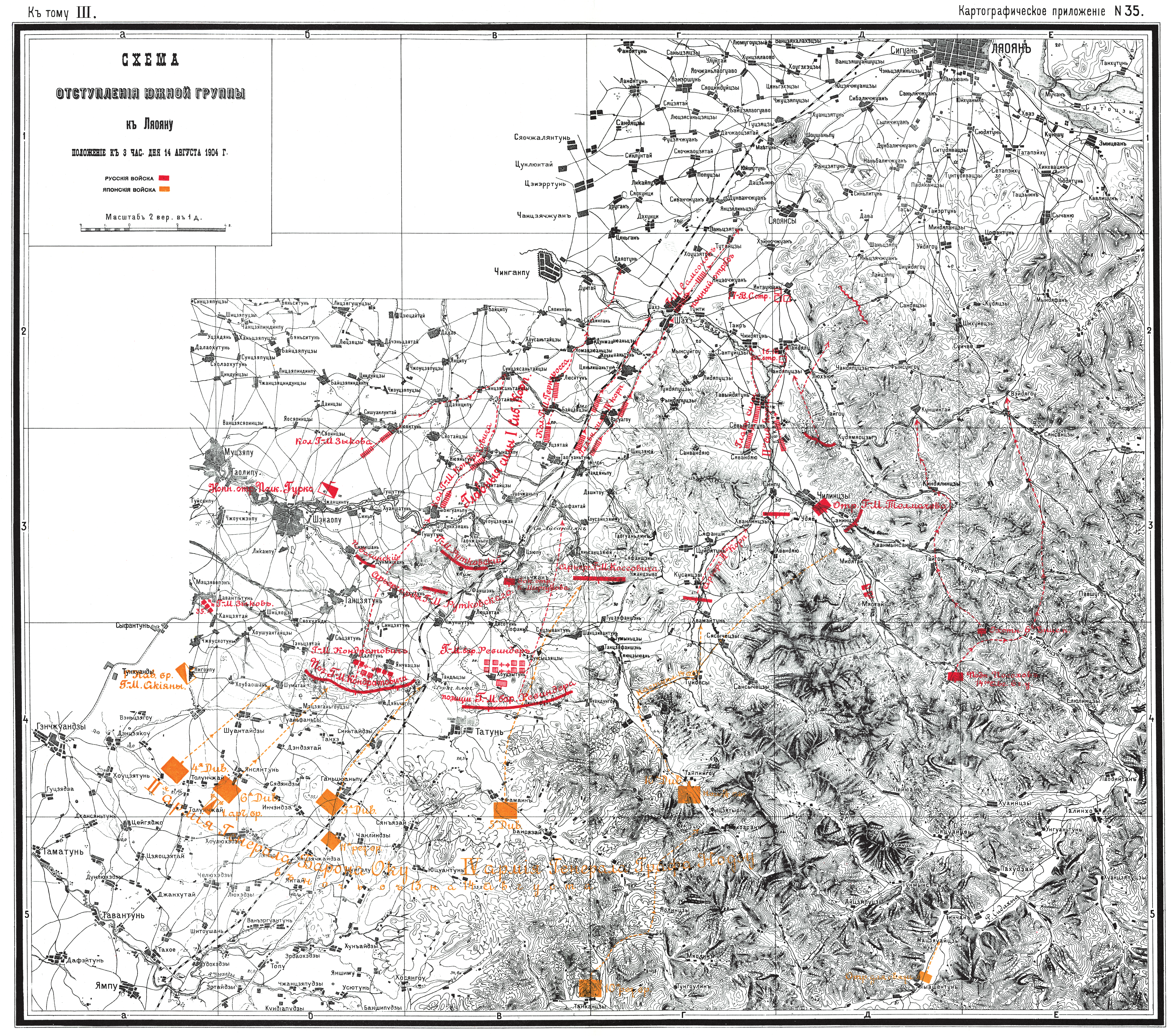 Схема отступления Южной группы к Ляояну. Положение к 3 часам дня 14 августа 1904 года