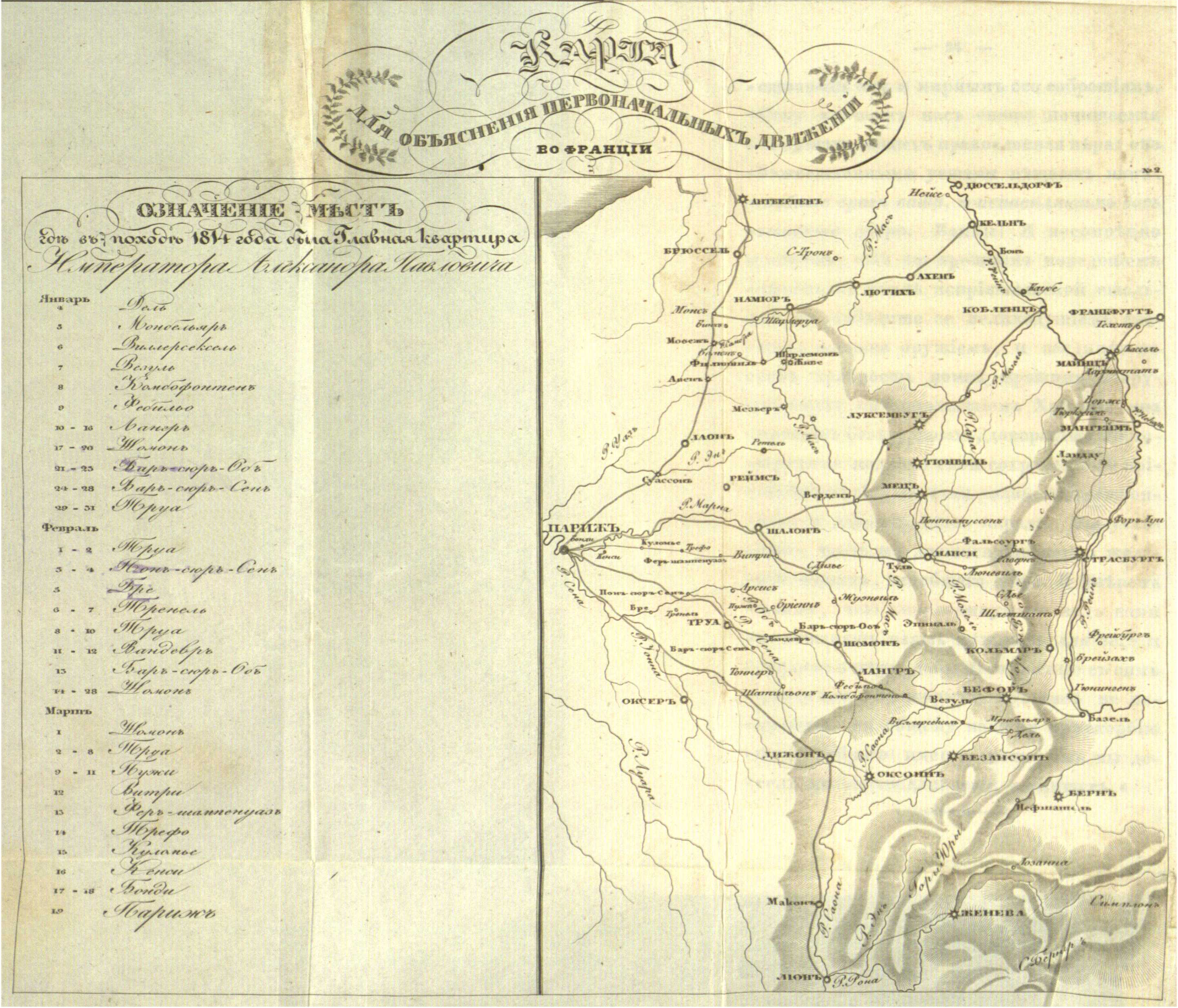 Карта для объяснения первоначальных движений во Франции с обозначением мест, где в походе 1814 года была Главная квартира Императора Александра Павловича.
