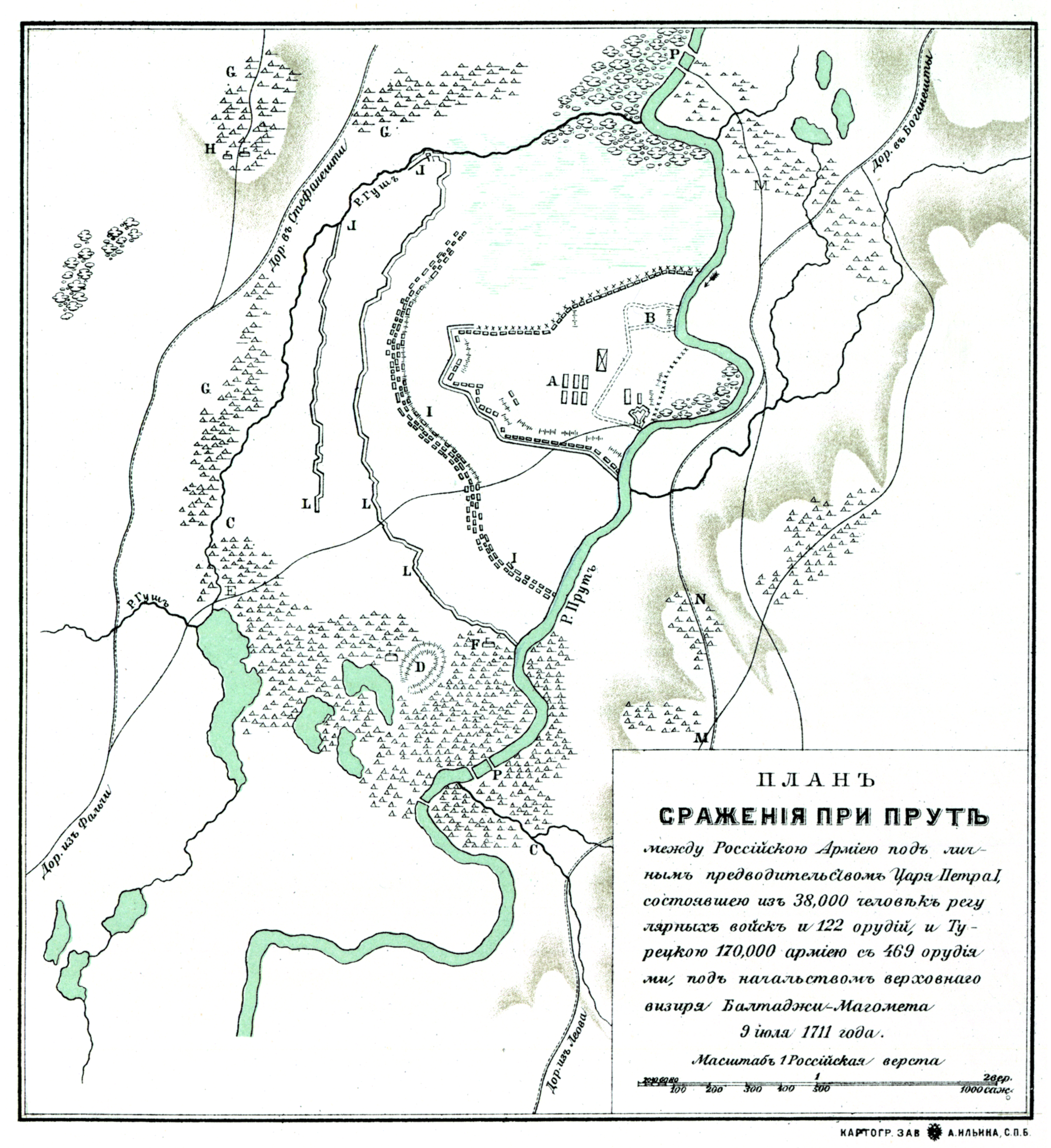 План сражения при Пруте между Российской Армией под личным предводительством Царя Петра I, состоявшей из 38 000 человек регулярных войск и 122 орудий, и Турецкой 170 000 армией с 469 орудиями, под начальством Балтанжи-Магомета 9 июля 1711 года