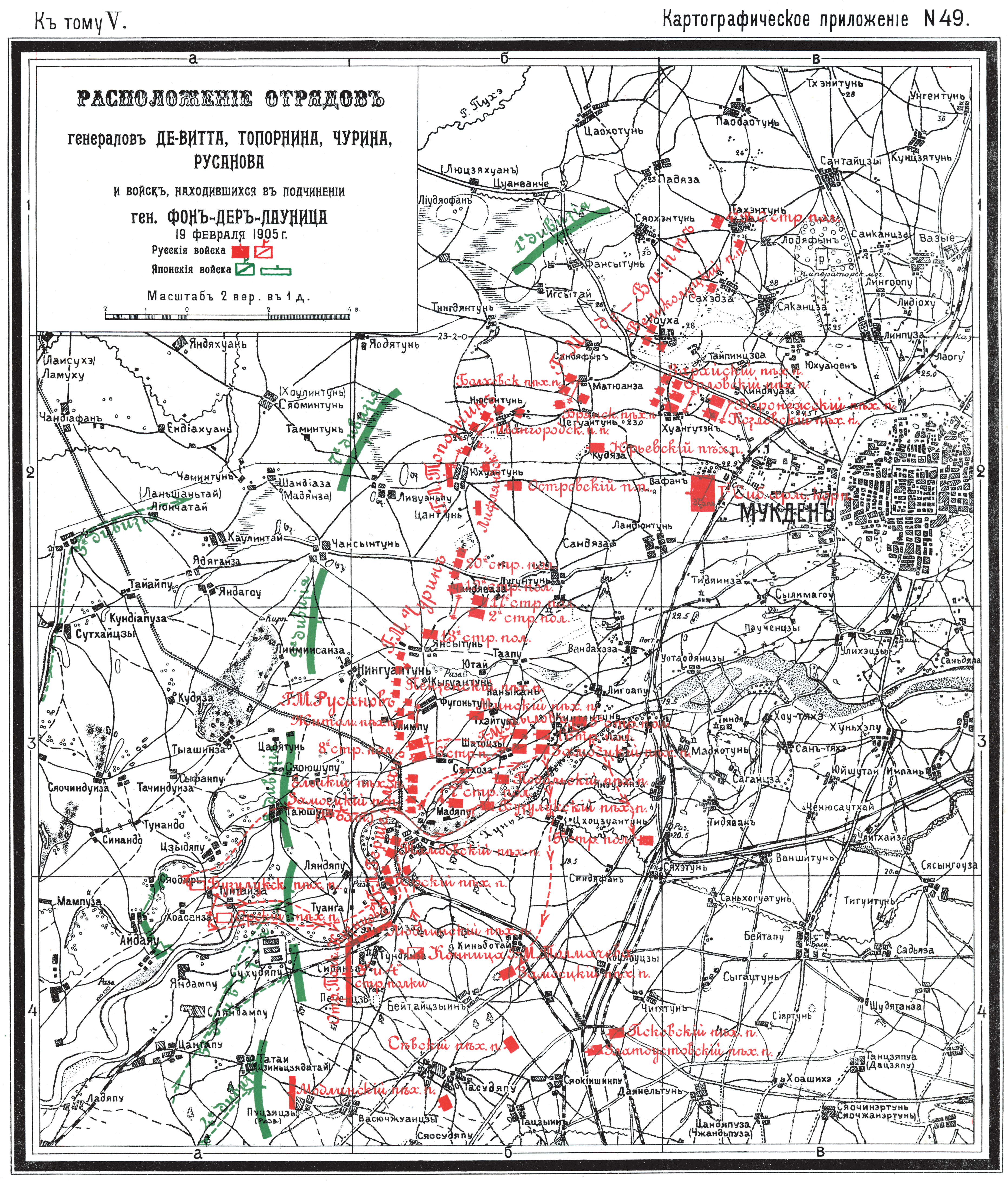 Расположение отрядов генералов де-Вита, Топорнина, Чурина, Русанова и войск, находившихся в подчинении генералаот кавалерии фон-дер-Лауница 19 февраля 1905 года
