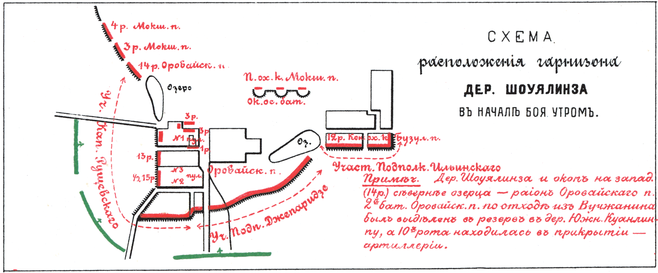 Расположение гарнизона деревни Шоуялинза в начале боя утром