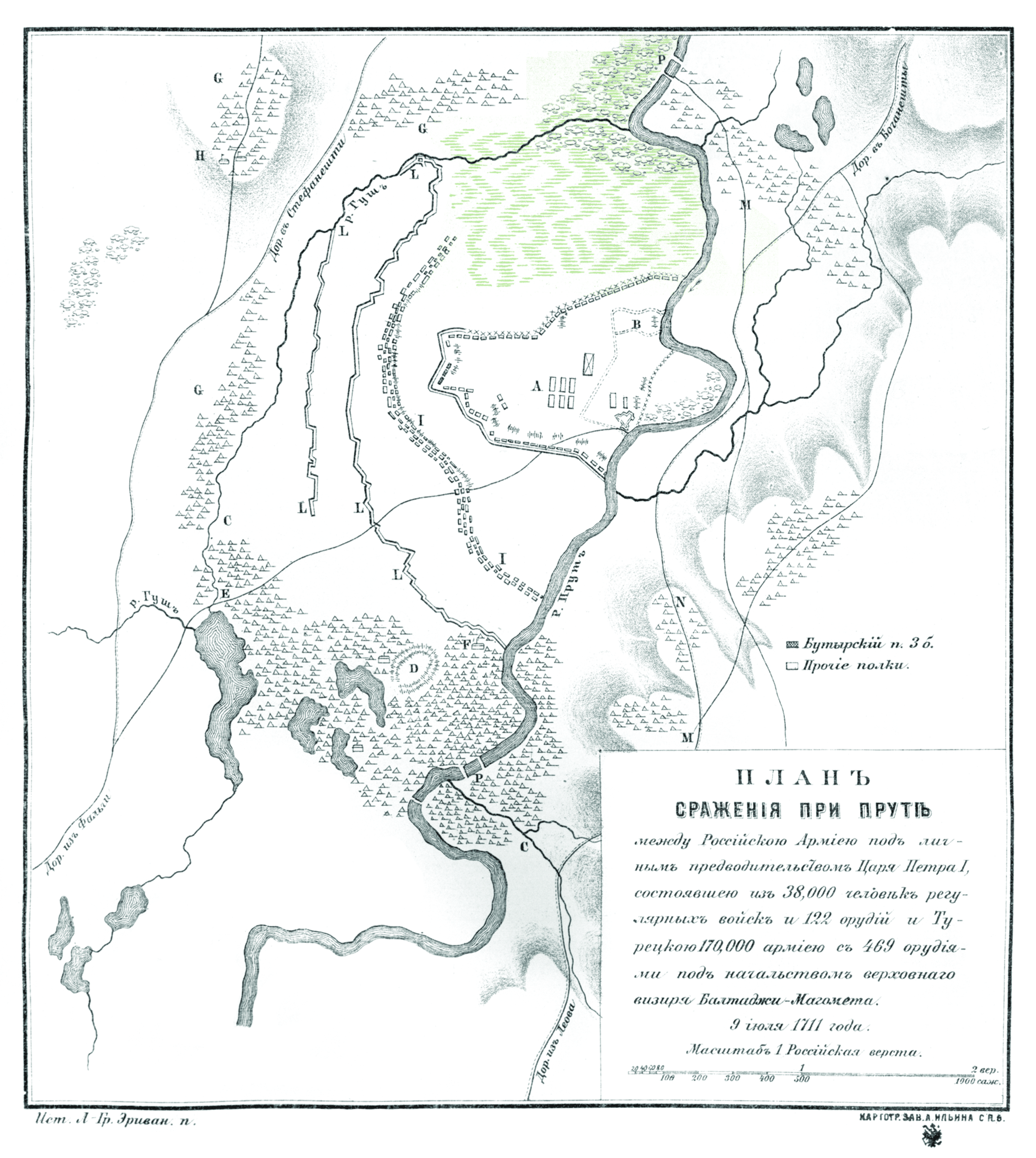 План сражения при Пруте между Российской Армией под личным предводительством Царя Петра I, состоявшей из 38 000 человек регулярных войск и 122 орудий, и Турецкой 170 000 армией с 469 орудиями, под начальством Балтанжи-Магомета 9 июля 1711 года