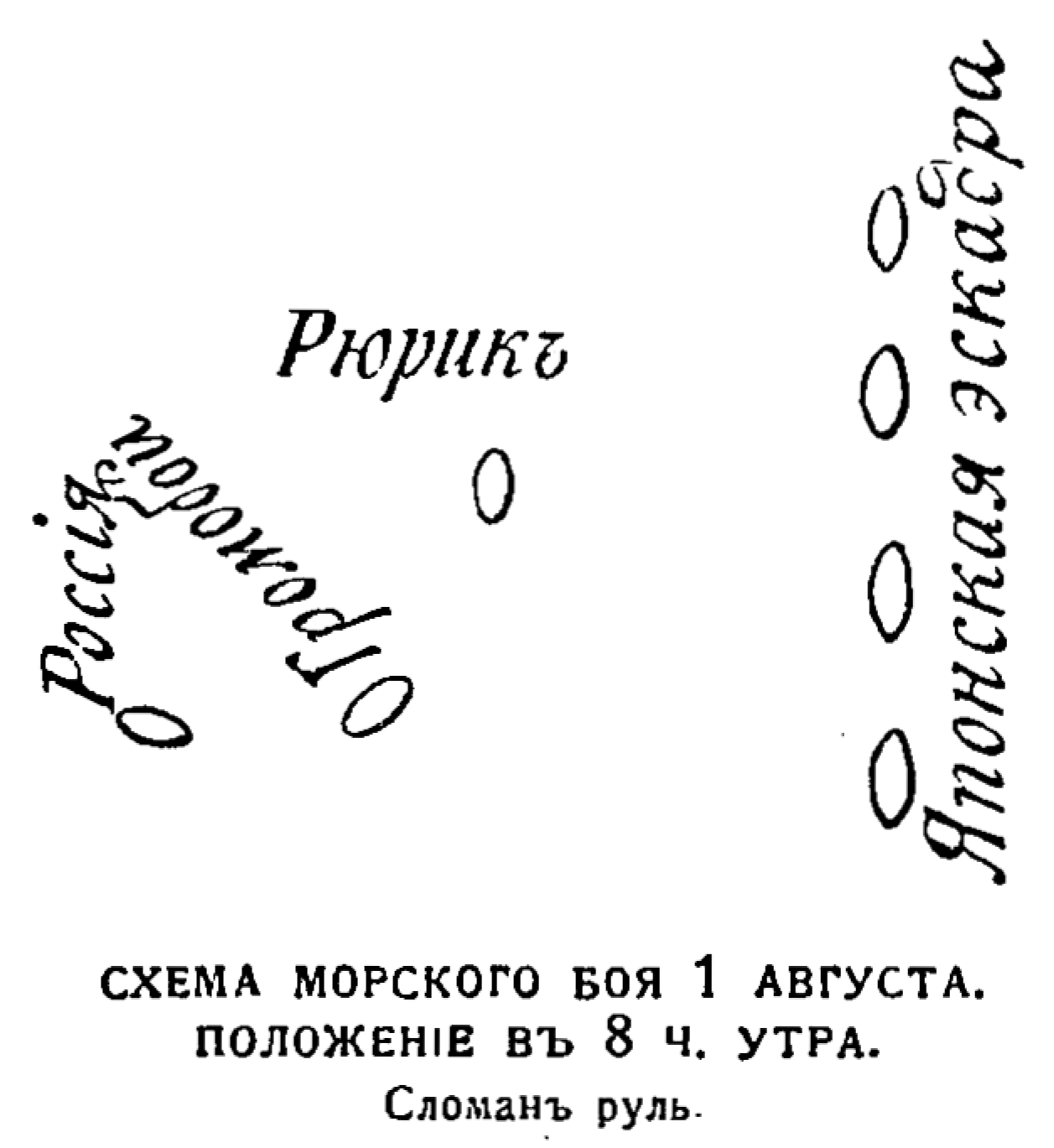 Схема морского боя 1 августа, положение в 9 часа утра. "Россия" и "Громобой" покидают "Рюрика"