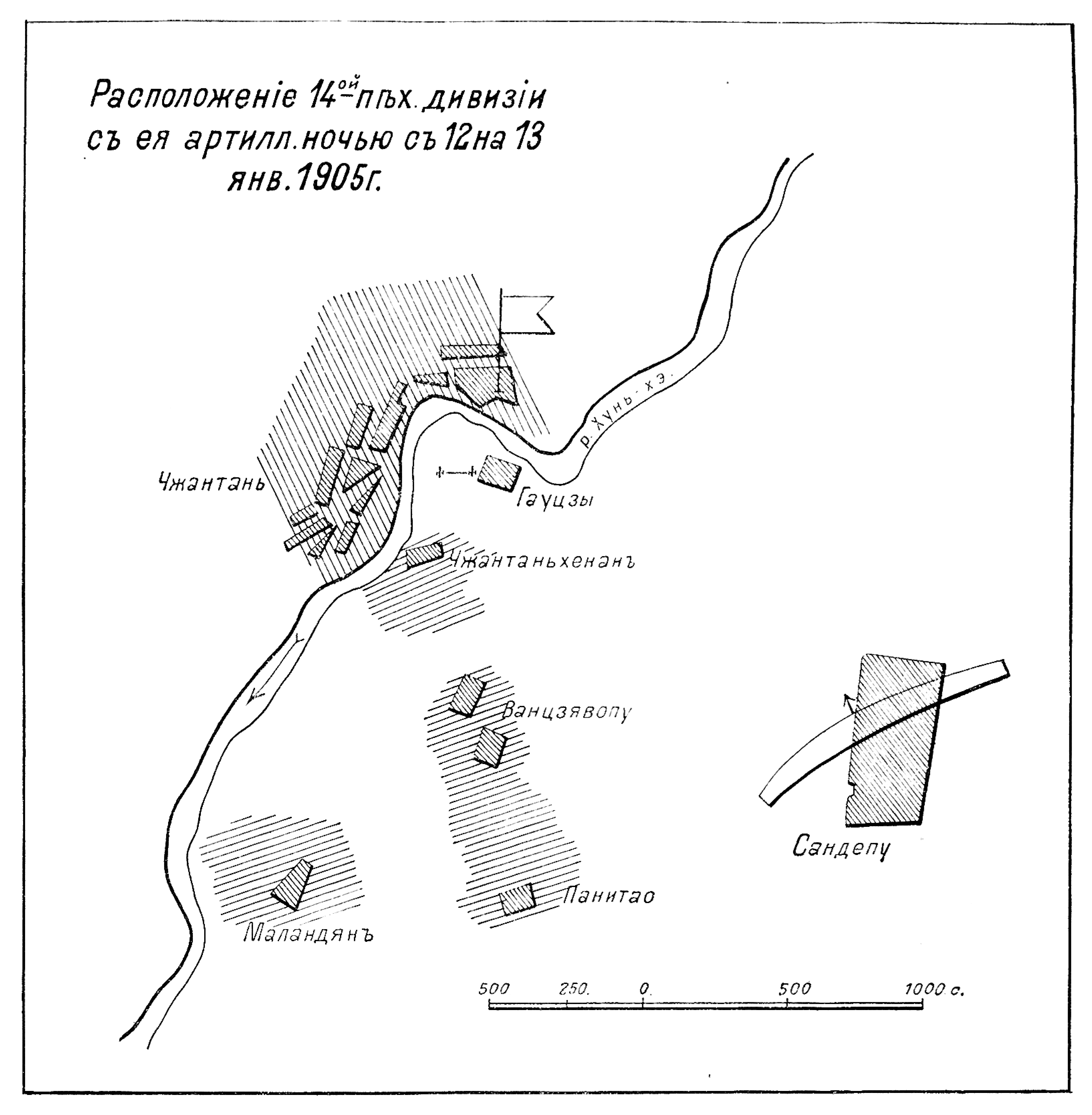 Расположение 14-ой пехотной дивизии с ее артиллерией ночью с 12 на 13 января 1905 года
