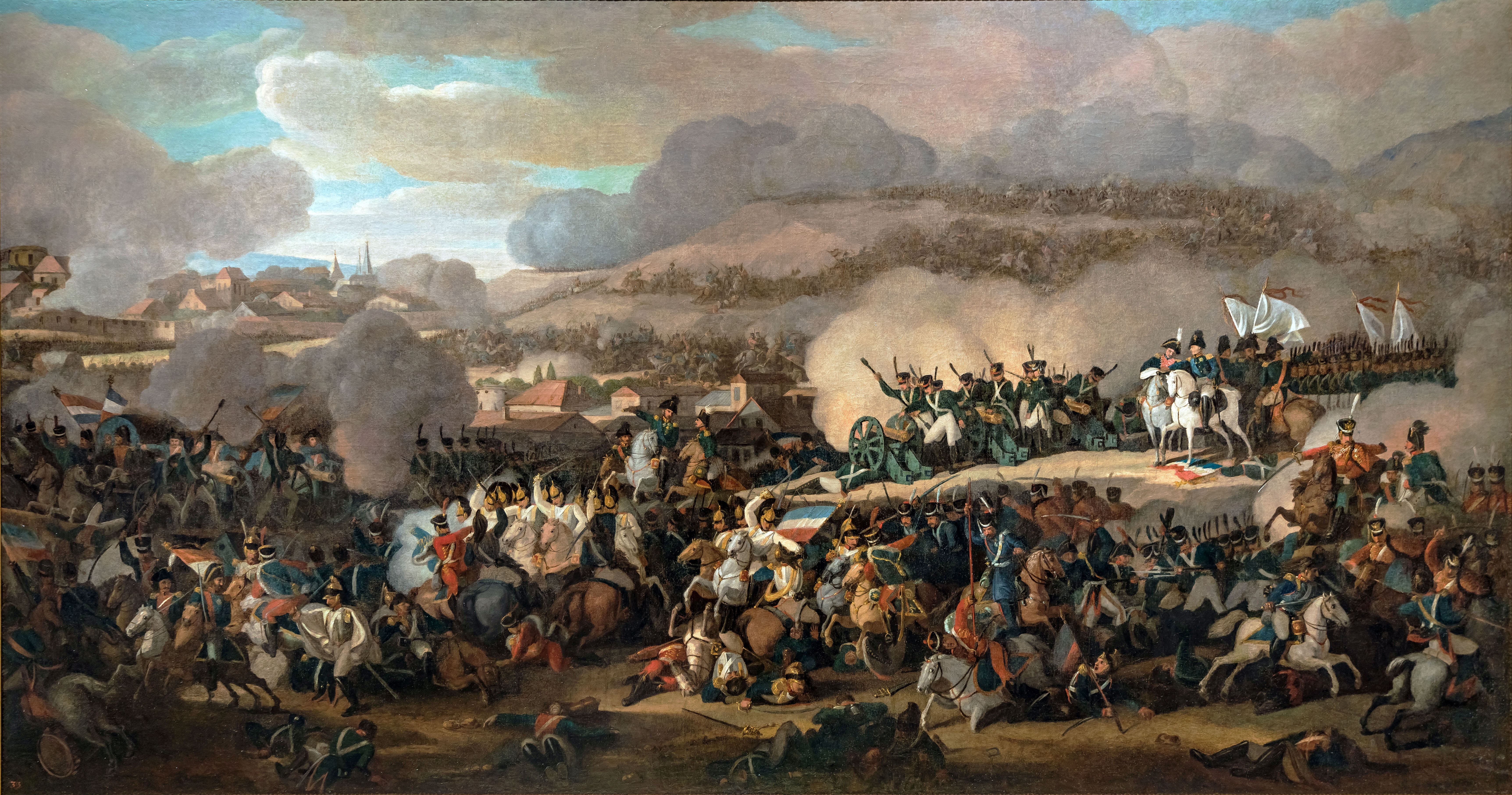 16 октября на равнине у города Лейпцига началась одна из величайших битв эпохи наполеоновских войн, вошедшая в историю под названием «битва народов». К началу битвы Наполеон имел, по разным источникам, от 155 до 175 тысяч человек и 717 орудий, союзники — около 200 тысяч человек и 893 орудия.В 10 часов утра битва началась канонадой союзных батарей и наступлением союзников на селение Вахау (Вашау). На этом направлении Наполеон сосредоточил несколько крупных батарей и силы пехоты, которые отбили все атаки союзников. В это время центр Богемской армии пытался пересечь реку Плейсу, чтобы ударить в обход левого фланга французов. Однако противоположный берег реки был весь усеян орудиями и французскими стрелками, которые метким огнем вынуждали неприятеля к отступлению.Первую половину дня на всех участках сражения битва шла с переменным успехом. В некоторых местах союзникам удавалось захватить несколько участков обороны противника, но французы и их союзники, напрягая силы, переходили в контратаки и отбрасывали неприятеля на исходные позиции. На первом этапе боя союзникам не удалось сломать мужественное сопротивление французов и добиться где-либо решительного успеха. Более того, умело организовав оборону своих позиций, Наполеон к 15 часам дня подготовил плацдарм для решительного наступления и прорыва союзного центра.Первоначально скрытые от глаз неприятеля 160 орудий по приказу генерала А. Друо обрушили ураганный огонь на место прорыва. «Земля дрожала от нестерпимого оглушительного рева. Отдельные дома снесло как ураганом; в Лейпциге за восемь верст звенели окна в рамах». (Герои и битвы. Общедоступная военно-историческая хрестоматия. М:, 1995. С. 218.) Ровно в 15 часов началась массированная атака пехоты и кавалерии. Против 100 эскадронов Мюрата выстроились в каре несколько батальонов принца Е. Вюртенбергского, ослабленные канонадой Друо, и открыли картечный огонь. Однако французские кирасиры и драгуны при поддержке пехоты смяли русско-прусскую линию, опрокинули гвардейскую кавалерийскую дивизию и прорвали центр союзников. Преследуя бегущих, они оказались в 800 шагах от ставки союзных государей. Этот ошеломляющий успех убедил Наполеона в том, что победа уже одержана. Властям Лейпцига было приказано звонить во все колокола в честь триумфа. Однако битва продолжалась. Александр I, раньше других поняв, что в битве наступил критический момент, приказал послать в бой батарею И. О. Сухозанета, русскую дивизию Н. Н. Раевского и прусскую бригаду Ф. Клейста. До подхода подкреплений неприятеля сдерживала рота русской артиллерии и лейб-казаки из конвоя Александра.Из своей ставки на холме у Тонберга Наполеон увидел, как пришли в движение резервы союзников, как свежие кавалерийские дивизии остановили Мюрата, закрыли брешь в союзных позициях и вырвали по сути дела из рук Наполеона уже торжествуемую им победу.