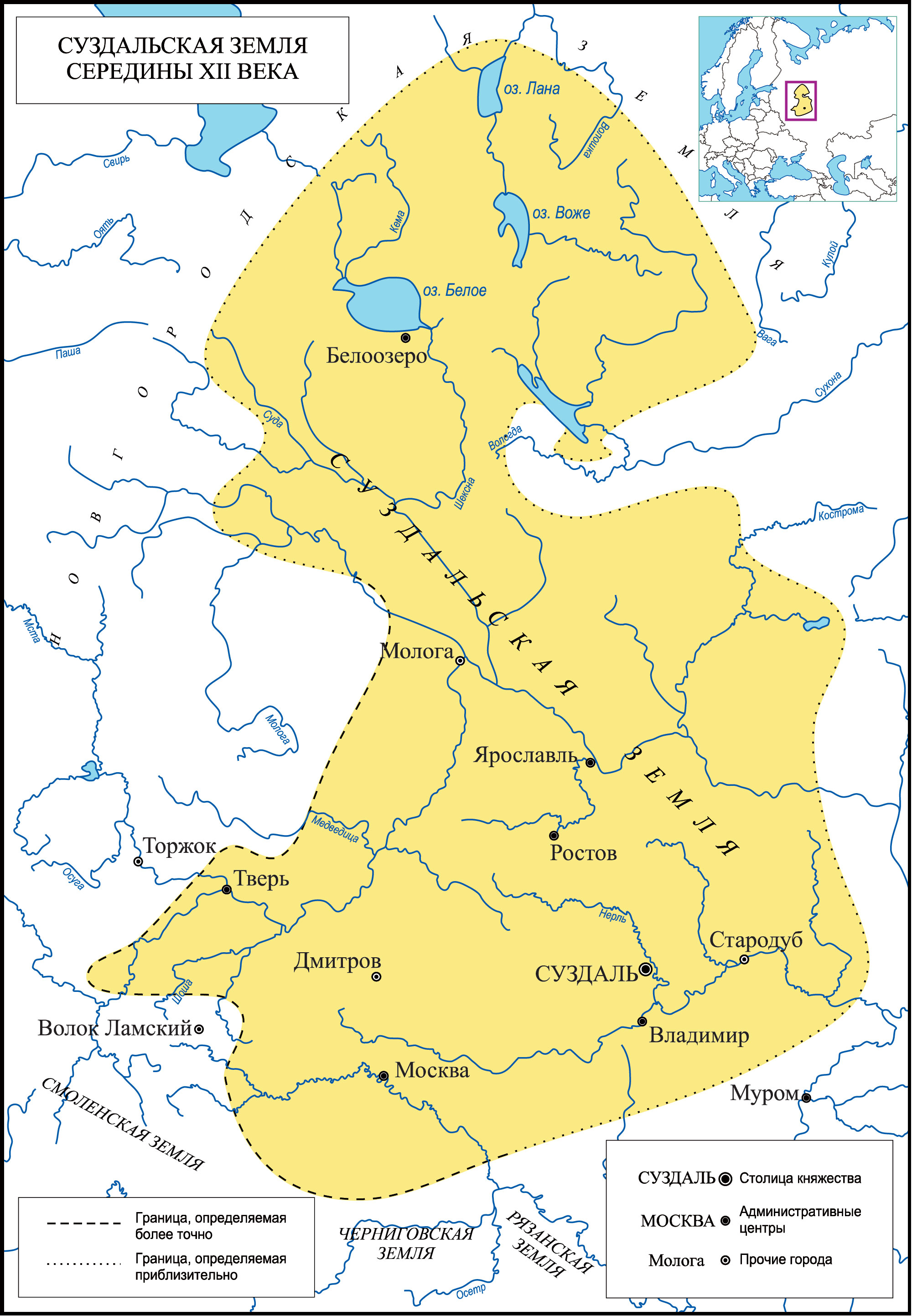 В XI веке регион оставался объектом управления киевских князей. После смерти Ярослава Мудрого (1054 г.) Ростовская земля перешла во владение Всеволода Ярославича. В этот период фиксируются социальные и экономические кризисы, в частности голод и восстание волхвов 1024 года, подавленное Ярославом. Дальнейшее развитие связано с деятельностью Владимира Мономаха, который в 1108 году основал Владимир-на-Клязьме, и его сына Юрия Владимировича (Долгорукого). Юрий перенес княжескую резиденцию в Суздаль, что дало название всему княжеству. Его правление ознаменовалось переходом к суверенной политике: если до 1125 года он действовал как наместник Киева, то после смерти отца стал независимым правителем. Юрий Долгорукий инициировал масштабное строительство крепостей (Москва, Переяславль-Залесский, Юрьев-Польский, Дмитров), обеспечивавших защиту от западных соседей и Волжской Булгарии.