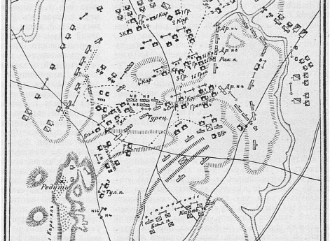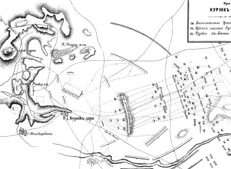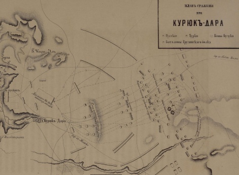 План генерального сражения при деревне Кюрюк-Дара 24 июля 1854 года. Между войсками Действующего Корпуса в Азиатской Турции под начальством Генерал-лейтенанта Князя Бебутова и Турецким 60-ти тысячным Корпусом под начальством Мушира Зафира Мустафы Паши