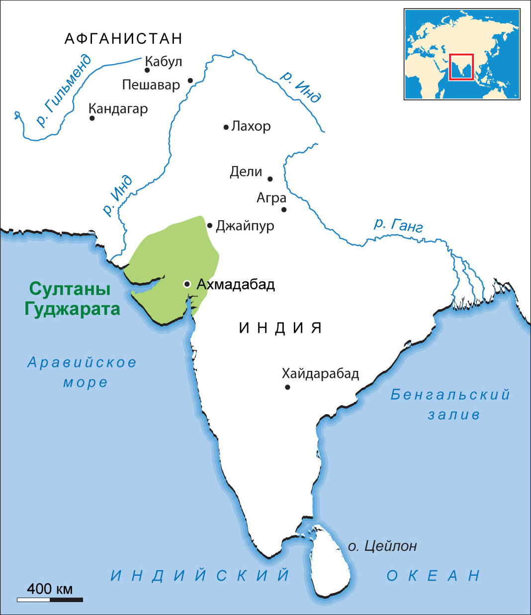 «Гуджерат долго оставался не затронутым мусульманским завоеванием, чем был обязан своему недоступному положению за великой пустыней и за холмами, соединяющими Виндию с хребтом Аравали; вследствие этого вторжение в страну иначе как со стороны моря было затруднительно. Только при Ала-ад-дине делийском, в конце XIII в., Гуджерат сделался мусульманской провинцией. В конце XIV в. он снова сделался самостоятельным, но уже под властью мусульманских, а не индусских правителей. Зафар-хан, сын новообращенного из раджпутов, в 794 г. был назначен наместни- ком Гуджерата, а в 1396 (799) г. объявил себя независимым. Он был окружен со всех сторон врагами, именно раджпутскими раджами и дикими племенами бхилов, и владел только узкой полосой земли между холмами и морем; однако эта береговая полоса тянулась на значительное пространство, по крайней мере до Сурата. Скоро он расширил пределы своего владения завоеванием Идара и Диу, разграбил Джхалор, а в 1407 г. на время овладел даже Мальвой. Его преемник Ахмед-шах I основал Ахмедабад, который сделался столицей династии, впоследствии, во время владычества великих моголов, был главным городом провинции и еще теперь остается значительным городом. Махмуд-шах I не только продолжал традиционные войны с Мальвой и Хандешом, но присоединил к своим владениям крепость Джунагарх в Каттиаваре и Чампанир, кроме того он содержал значительный флот для покорения пиратов-островитян и для нападения на португальцев. Последним Бахадур-шах, завоеватель Мальвы, позволил построить факторию в Диу, но сам же пал от их рук. Последние годы владычества династии были омрачены интригами мятежных аристократов, и цари сделались только подставными лицами; наконец, в 1572 (980) г. разоренная область была завоевана Акбаром, который вернул ей прежнее благосостояние»