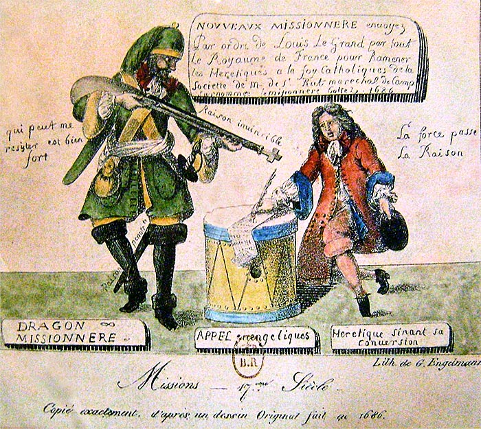 «Драгоннада». Драгун короля Людовика XIV заставляет гугенота перейти в католичество. Автор: Энгельман Годфруа (фр. ) Godefroy Engelmann (1788 – 1839). 1 четверть XIX века. Литография копируящая анонимный рисунок 1686 года. Международный музей протестантской Реформации, Женева. Надписи на рисунке: «Новый миссионер, отправленный по приказу Луи Великого по всему королевству дабы привести еретиков в католическую веру, из людей маркиза де Сен-Рута, генерала, прозванного «миссионер Gottez» Драгун-миссионер: (qui peut me résister est bien fort) Лишь тот, кто очень силен, может сопротивляться мне. [У ствола его мушкета]: (Raison invincible) Непререкаемый довод [У барабана]: (Appel évengélique) Благовест Евангельский Еретик, подписывающий акт конверсии: (la force passe la Raison) Сила одолевает рассудок