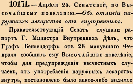 10171. 1837 год. 6 мая (24 апреля ст.ст.) Сенатский, по Высочайшему повелению. Об отличии наружных лекарств от внутренних.Правительствующий Сенат слушали рапорт Г.Министра Внутренних Дел, что граф Бенкендорф от 28 минувшаго Февраля сообщил ему Высочайшее повеление, чтобы для предупреждения несчастных случаев, от употребления наружных лекарств внутрь, постановлено было какое-либо видимое отличие лекарств наружных от внутренних, или формою и цветом сигнатур, или чем-либо другим <…>
