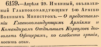 6159. 1833 год. 29 апреля (11 мая). Именный, объявленный Главнокомандующему 1-ю Армиею Военным Министром. О предоставлении Главнокомандующим Армиями и Командирам Отдельных Корпусов дозволять Офицерам, по слабости зрения, носить очки.