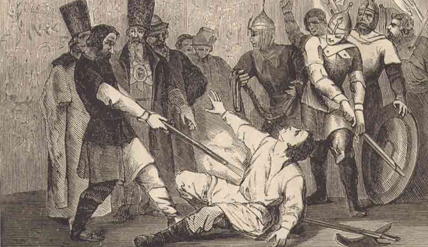 «17 Маия, в четвертом часу дня, прекраснейшего из весенних, восходящее солнце осветило ужасную тревогу столицы: ударили в колокол сперва у Св. Илии, близ двора гостиного, и в одно время загремел набат в целой Москве, и жители устремились из домов на Красную площадь с копьями, мечами, самопалами, Дворяне, Дети Боярские, стрельцы, люди приказные и торговые, граждане и чернь. Там, близ лобного места, сидели Бояре на конях, в шлемах и латах, в полных доспехах, и представляя в лице своем отечество, ждали народа. Стеклося бесчисленное множество людей, и ворота Спасские растворились: Князь Василий Шуйский, держа в одной руке меч, в другой Распятие въехал в Кремль, сошел с коня, в храме Успения приложился к святой иконе Владимирской и, воскликнув к тысячам: "во имя Божие идите на злого еретика!" указал им дворец, куда с грозным шумом и криком уже неслися толпы, но где еще Царствовала глубокая тишина! Пробужденный звуком набата, Лжедимитрий в удивлении встает с ложа, спешит одеться, спрашивает о причине тревоги: ему ответствуют, что, вероятно, горит Москва; но он слышит свирепый вопль народа, видит в окно лес копий и блистание мечей; зовет Басманова, ночевавшего во дворце, и велит ему узнать предлог мятежа. Сей Боярин, духа твердого, мог быть предателем, но только однажды: изменив Государю законному, уже стыдился изменить Самозванцу и, тщетно желав образумить, спасли легкомысленного, желал по крайней мере не разлучаться с ним в опасности. Басманов встретил толпу уже в сенях: на вопрос его, куда она стремится? в несколько голосов кричат: "веди нас к Самозванцу! выдай нам своего бродягу!" Басманов кинулся назад, захлопнул двери, велел телохранителям не пускать мятежников и, в отчаянии прибежав к расстриге, сказал ему: "Все кончилось! Москва бунтует; хотят головы твоей: спасайся! Ты мне не верил!" Вслед за ним ворвался в Царские покои один Дворянин безоружный, с голыми руками, требуя, чтобы мнимый сын Иоаннов шел к народу, дать отчет в своих беззакониях: Басманов рассек ему голову мечом. Сам Лжедимитрий, изъявляя смелость, выхватил бердыш у телохранителя Шварцгофа, растворил дверь в сени и, грозя народу, кричал: "Я вам не Годунов!" Ответом были выстрелы, и Немцы снова заперли дверь; но их было только 50 человек, и еще, во внутренних комнатах дворца, 20 или 30 Поляков, слуг и музыкантов: иных защитников, в сей грозный час, не имел тот, кому накануне повиновались миллионы! Но Лжедимитрий имел еще друга: не находя возможности противиться силе силою, в ту минуту, когда народ отбивал двери, Басманов вторично вышел к нему - увидел Бояр в толпе, и между ими самых ближних людей расстригиных: Князей Голицыных, Михайла Салтыкова, старых и новых изменников; хотел их усовестить; говорил об ужасе бунта, вероломства, безначалия; убеждал их одуматься; ручался за милость Царя. Но ему не дали говорить много: Михайло Татищев, им спасенный от ссылки, завопил: "злодей! иди в ад вместе с твоим Царем!" и ножом ударил его в сердце. Басманов испустил дух, и мертвый был сброшен с крыльца... судьба достойная изменника и ревностного слуги злодейства, но жалостная для человека, который мог и не захотел быть честию России!»