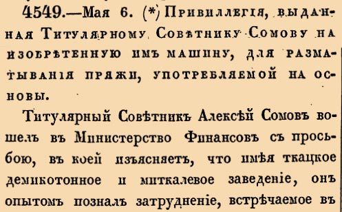 4549. 1831 год. 18 мая (6 мая ст.ст.) Привиллегия, выданная Титулярному Советнику Сомову на изобретенную им машину, для разматывания пряжи, употребляемой на основы.Титулярный Советник Алексей Сомов вошел в Министерство Финансов с просьбою, в коей изъясняет, что имея ткацкое демикотонное и миткалевое заведение, он опытом познал затруднение, встречаемое в разматывании изготовленной и оклеенной основной бумаги с мотков на катушки или шпули <…>