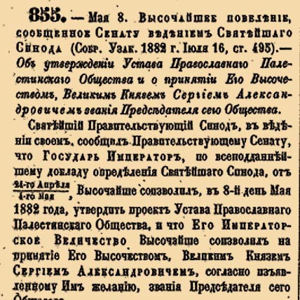 855. 1882 год. 8 мая (20 мая). Высочайшее повеление, сообщенное Сенату ведением Святейшаго Синода. Об утверждении Устава Православнаго Палестинскаго Общества и о принятии Его Высочеством, Великим Князем Сергием Александровичем звания Председателя се...