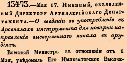 13473. 1840 год. 17 мая (29 мая). Именный, объявленный Директору Артиллерийскаго Департамента. О введении в употребление в Арсеналах инструмента для поверки направления высверленнаго канала в орудиях.