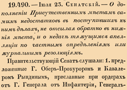 19490. 1800 год (4 августа (23 июля ст.ст.) Сенатский. О дополнении Пристуственным местам самим недостатков в поступивших к ним делам, не отсылая обратно в нижния места, и о недаче тяжущимся апелляции по частным определениям или журнальным резолюциям.<…> Сенат за нужное находит, как вышеписанных Палат Суда и Расправы 2-м Департаментам, так и всем вообще сделать предписание, чтобы они впредь, буде бы при ревизии какого-либо взносимаго к ним тяжебнаго дела примечены ими были в каком случае недостатки <….>