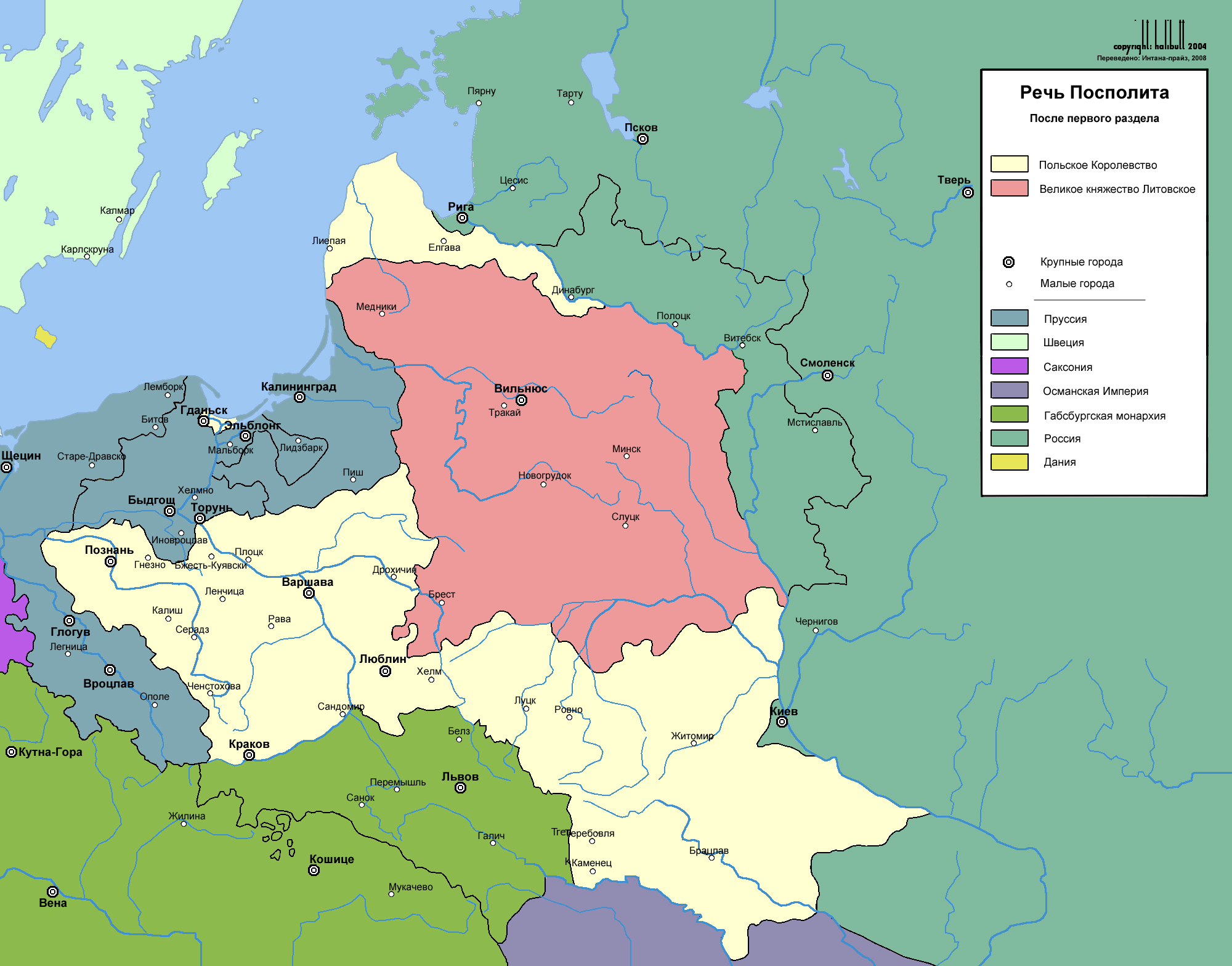 По условиям раздела Россия получила наиболее обширные территории польской Ливонии и части Белоруссии площадью 92 тыс. км², Австрии досталась Малопольша с территорией в 83 тыс. км², а Пруссии - 36 тыс. км². Вслед за первым последовали второй (1793 год) и третий (1795 год) разделы Польского королевства, после чего страна перестала существовать на 123 года. «В продолжение шести-семи лет сумятицы, поднявшейся в Польше со смерти короля Августа III (1763 г.), в русской политике незаметно мысли о воссоединении Западной Руси: она затерта вопросами о гарантии, диссидентах, конфедерациях. Забота Панина о присвоении России покровительства диссидентам "на вечные времена" скорее указывает на то, что ему была совсем чужда эта мысль. Русский кабинет сначала довольствовался (думал только) исправлением границы с польской стороны и каким-нибудь территориальным вознаграждением Фридриха за содействие в Польше. Но русско-турецкая война дала делам более широкое течение. Фридрих сперва испугался этой войны, опасаясь, что Австрия, злобясь на русско-прусский союз, вмешается в нее, станет за Турцию, впутает и Пруссию. С целью отклонить эту опасность из Берлина с самого начала войны и была пущена в ход мысль о разделе Польши. Эта идея ничья; она сложилась сама собой из всего строя, быта и соседского окружения Речи Посполитой и носилась в дипломатических кругах давно, уже с XVII в. При деде и отце Фридриха II три раза предлагали Петру I раздел Польши и всегда непременно с уступкой прусскому королю западной Пруссии, отделявшей досадным промежутком Бранденбург от восточной Пруссии. Фридриху II принадлежит не самая идея, а ее практическая разработка. Он сам признавался, что, страшась усиления России, он попробовал без войны, без жертв и риска, только ловкостью извлечь пользу из ее успехов. Война России с Турцией дала ему желанный случай, который он, по его выражению, ухватил за волосы. По его плану к союзу России с Пруссией привлекалась враждебная им обеим Австрия для дипломатического - только отнюдь не вооруженного - содействия России в войне с Турцией, и все три державы получали земельное вознаграждение не от Турции, а от Польши, подавшей повод к войне. После трехлетних переговоров, веденных с "притворной добросовестностью", по выражению Панина, участники, перетасовывая области и населения, как игральные карты, подвели такие итоги игры. Молдавия и Валахия, христианские княжества, отвоеванные у турок русскими войсками, возвращались именно по настоянию Фридриха, союзника, под турецкое иго, освобождение от которого им было торжественно обещано, а взамен этой уступки русский кабинет, обязавшись охранять территориальную целость христианской Польши от хищных соседей, заставил Россию вместе с ними участвовать в ее расхищении. Вышло так, что одни польские области отходили к России взамен турецких за военные издержки и победы, а другие - к Пруссии и Австрии так, ни за что, или к первой как бы за комиссию и за новую постановку дела, за фасон, а ко второй в виде отступного за вражду к России, вызванную ее союзом с той же Пруссией. Наконец, в 1772 г. (25 июля) последовало соглашение трех держав-дольщиц, по которому Австрия получала всю Галицию с округами, захваченными еще до раздела, Пруссия - западную Пруссию с некоторыми другими землями, а Россия - Белоруссию (ныне губернии Витебская и Могилевск