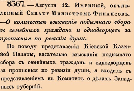 8367. 1835 год. 24 августа (12 августа ст.ст.) Именный, объявленный Сенату Министром Финансов. О количествах взыскания подымнаго сбора с семейных граждан и однодворцев за прописныя по ревизии души. По поводу представления Киевской Казенной Палаты, касательно взыскания подымнаго сбора с семейных граждан и однодворцев за прописныя по ревизии души, я входил с представлением в Комитет о делах Западных губерний <…>