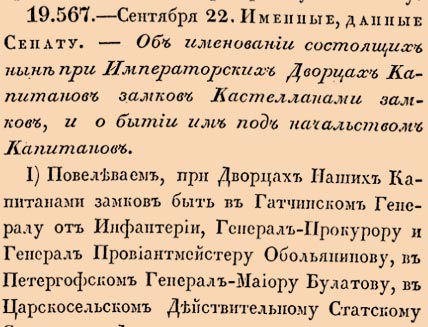 Об именовании состоящих ныне при Императорских Дворцах Капитанов замков Кастелланами замков, и о бытии им под начальством Капитанов.