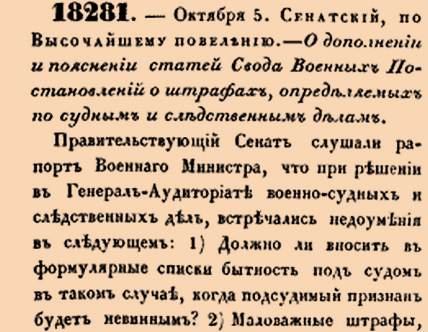 18281. 1844 год. 17 октября (5 октября ст.ст.) Сенатский, по Высочайшему повелению. Дополнении и пояснении статей Свода Военных Постановлений о штрафах, определяемых по судным и следственным делам. Правительствующий Сенат слушали рапорт Военнаго Министра, что при решении в Генерал-Аудиториате военно-судных и следственных дел, встречались недоумения в следующем: 1) Должно ли вносить в формулярные списки бытность под судом в таком случае, когда подсудимый признан будет невинным?<…>