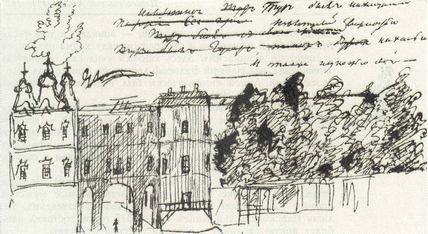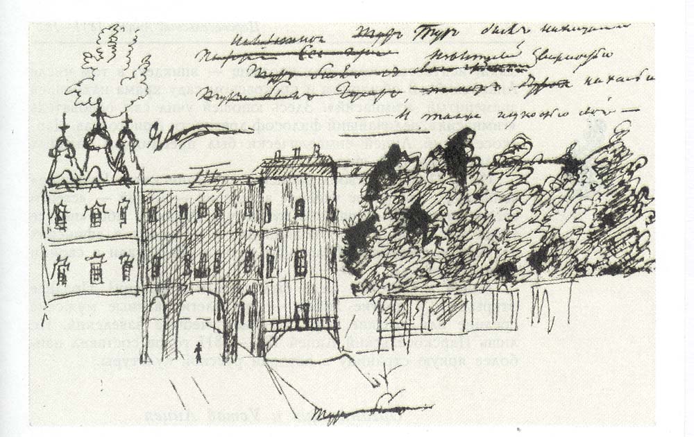 Царскосельский лицей. А.С. Пушкин. 1831 год. Рисунок в черновике VII главы «Евгения Онегина»