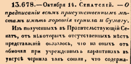Указ Сената от 14 октября 1771 года, предписывающий всем государственным учреждениям использовать качественные чернила и бумагу. Мера была вызвана тем, что документы, обрабатываемые уксусом на карантинах, становились нечитаемыми. Цель указа — предотвратить задержки в решении важных государственных дел из-за порчи корреспонденции.