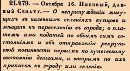 Закон № 21.479. — 1804 год 28 октября (16 октября). Указ, определяющий правила проживания, налогообложения и несения повинностей для купцов и мещан, живущих в казенных селениях.