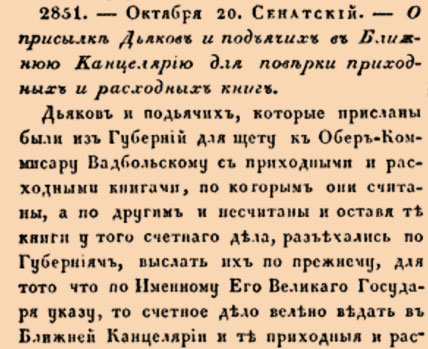 Закон № 2851 — 1714 год 31 октября (20 октября). Указ о возвращении дьяков и подьячих в Санкт-Петербург для передачи и проверки счётных книг в Ближней Канцелярии.