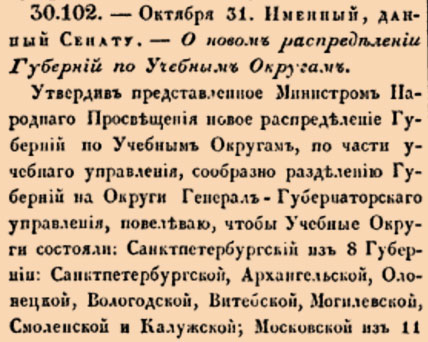 Закон № 30.102. — 1824 год 31 октября (12 ноября). Указ о новом административном делении губерний Российской империи по учебным округам.