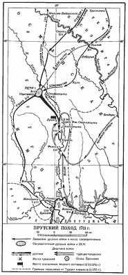 Перейдя Днестр у Сорок, Петр 20-го июня созвал военный совет, на котором было решено двинуться вперед. Только генерал Галард заметил, что русская армия находится в том же положении, в котором был Карл XII, вступая в Малороссию.