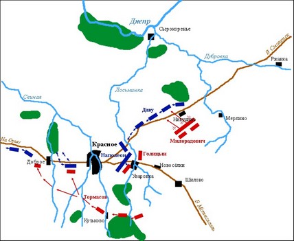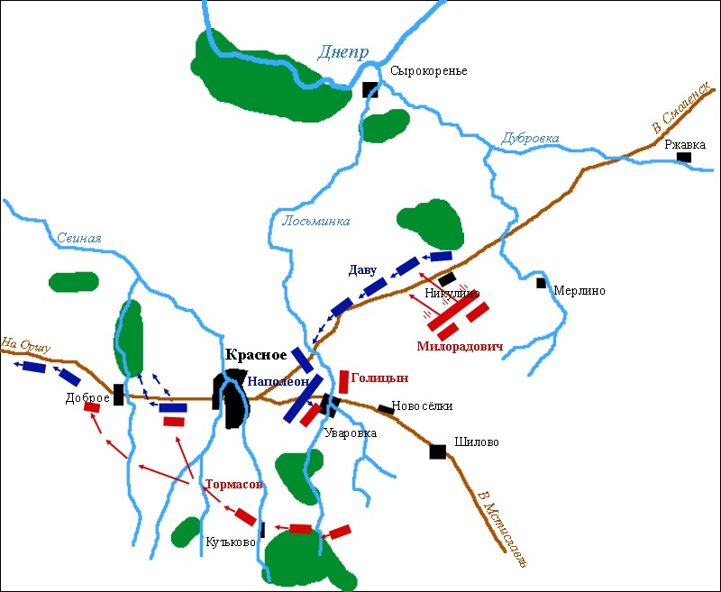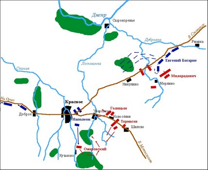 Наполеон опасался, что Даву и Ней подвергнутся той же, если не худшей, участи, и потому решил, что Жюно и Понятовский будут продолжать движение на Оршу, а Евгений на Ляды; сам же он с гвардией и Мюратом расчистит дорогу своим последним корпусам путем наступления против Кутузова, рассчитывая этим побудить последнего отозвать к себе Милорадовича. Итак, 17 ноября он двинулся с 14 000 человек между Кутьковом и Красным против Кутузова.