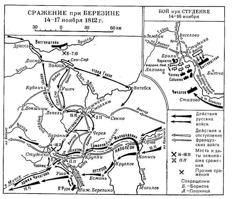 «В ночь с 25 на 26 ноября в Студянку вступила императорская гвардия, а на рассвете появился и Наполеон. Он приказал немедленно начать переправу. Под руками у него было в ту минуту всего 19 тысяч бойцов. Переправа шла уже при перестрелке с отрядом генерала Чаплица, который первый заметил, что Наполеон уводит куда-то из Борисова свои войска. Наполеон велел занять прочно оба берега у наведенных мостов через Студянку. Весь день 26 ноября к нему подходили войска. В ночь с 26-го на 27-е Наполеон велел переправиться на правый берег маршалу Нею с остатками его корпуса и со всей молодой гвардией. Всю ночь и все утро 27 ноября продолжалась переправа, и французские батальоны один за другим переходили на правый берег. Во втором часу дня 27 ноября двинулась старая гвардия с Наполеоном. За старой гвардией пошли дивизии корпуса Виктора. Переправившаяся французская армия выстраивалась на правом берегу.
