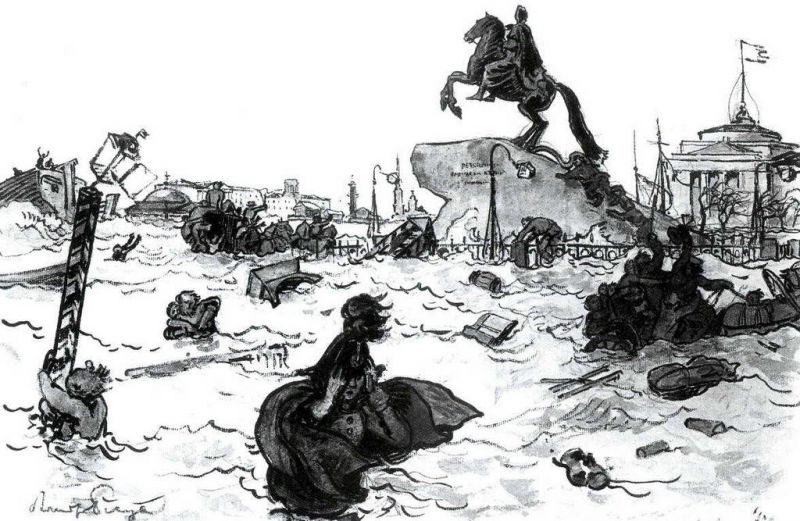Но самое крупное наводнение за всю историю Петербурга произошло 7 ноября 1824 года, и последствия его были страшными. Вода в Неве поднялась на 13 футов и 7 дюймов! То есть выше ординара на четыре с лишним метра! Именно о нем написал в своей замечательной поэме "Медный всадник" Александр Сергеевич Пушкин: