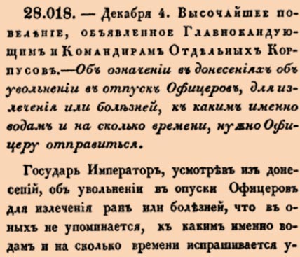 Закон № 28018. 1819 год. 4 декабря (16 декабря). О правилах оформления офицерских отпусков для лечения на водах.