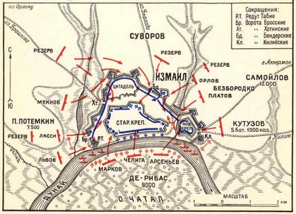 Ночь выдалась темная, непроглядная; по временам раздавались одиночные выстрелы, освещая на секунду то тот, то другой угол нашего лагеря. И эти выстрелы смолкли. Среди ночной тишины по временам из крепости доносился какой-то неясный, зловещий гул. Мало кто спал в эту ночь. Не спал и Суворов; он ходил по бивакам, вступал в беседу с офицерами, шутил с солдатами. Вспоминая былые победы, он обещал успех и на сегодня. Вернувшись к себе, Суворов прилег к огню, но не спал; его окружала большая свита адъютантов, ординарцев, гвардейских офицеров, придворных, знатных иностранцев. Многие из последних принесли большую пользу во время штурма, а со временем прославили свое имя на полях Европы громкими победами. Сюда они приехали учиться. В три часа ночи взвилась ракета. Наши войска поднялись с биваков, устроились и выступили к сборным местам В 5 1/2 час, при густом тумане, штурмовые колонны пошли на приступ. Три правые колонны находились под общим начальством Потемкина, а три левые — Самойлова; 1-ю колонну вел Львов, 2-ю — Ласси, 3-ю — Мэкноб — генералы испытанной храбрости, бравшие штурмом Очаков. В этих колоннах было 15 батальонов пехоты да в прикрытии 3 полка конницы. Левые колонны вели на штурм по порядку нумеров: бригадиры Орлов, Платов и генерал-майор Голенищев-Кутузов — все трое подвизались впоследствии, в эпоху Александра, в тяжелые годы борьбы с Наполеоном. Теперь под их начальством находилось 7 батальонов пехоты, 8 тысяч казаков, тысяча арнаутов, а в резерве 4 полка казаков, 12 эскадронов карабинеров и гусар. Нужно прибавить, что спешенные казаки 4-й и 5-й колонн, потерявшие своих лошадей под Очаковым, были вооружены вместо ружей укороченными пиками. Колонны двигались в порядке, в глубокой тишине. Турки сидели смирно, не выдавая себя ни единым звуком. Раньше других подошла к назначенному ей месту, именно левее Бросских ворот, вторая колонна под начальством Ласси. Сажен за 300 или за 400 турки встретили ее адским огнем. В одну минуту загорелся весь валганг; загремело 700 орудий, затрещали ружья; крепость стала похожа на грозный вулкан, извергавший пламя и дым; небо и земля были в огне, и в довершение ужаса по всему валу раздавался протяжный, раздирающий душу крик: «Ал—ла Ал—ла», как последнее, похоронное пение. Вторая колонна оробела, солдаты затоптались на месте, но бывший тут Потемкин сумел их увлечь — они бросились вперед, живо забросали ров фашинами. Измайловского полка прапорщик Гагарин приставил лестницы, по которым стали подниматься, первыми вошли майор Неклюдов, начальник стрелков, и Ласси. Турки с яростью набросились на этих храбрецов; они пустили в ход кинжалы, сабли, копья; но на место павших прибежали другие; поднялась голова колонны, успела утвердиться и сейчас же, не спускаясь в город, пошла забирать влево, к Хотинским воротам. Почти в то же время подходила первая колонна, ее вели фанагорийцы, любимые дети Суворова. Перед этой колонной возвышался каменный редут, табия, замыкавший измаильские укрепления у самого берега Дуная. Взять его в лоб не было никакой возможности; колонна повернула вправо, к палисаду, протянутому от редута к реке. Генерал Львов перелез через него первым, за ним фанагорийцы, потом апшеронские егеря. Несмотря на страшный картечный огонь из редута, они быстрым натиском в штыки тотчас овладели с тыла ближайшими турецкими батаре