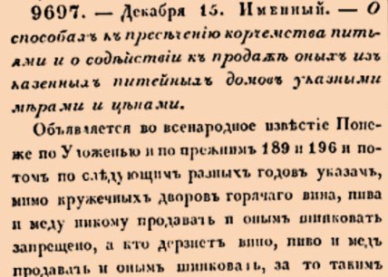 9697. 1749 год. 26 декабря (15 декабря ст.ст.) Именный. О способах к пресечению корчемства питьями и о содействии к продаже оных из казенных питейных домов указными мерами и ценами.Объявляется во всенародное известие Понеже по Уложенью и по прежним 189 и 196 и потом по следующим разных годов указам, мимо кружечных дворов горячаго вина, пива и меду никому продавать и оным шинковать запрещено <…>