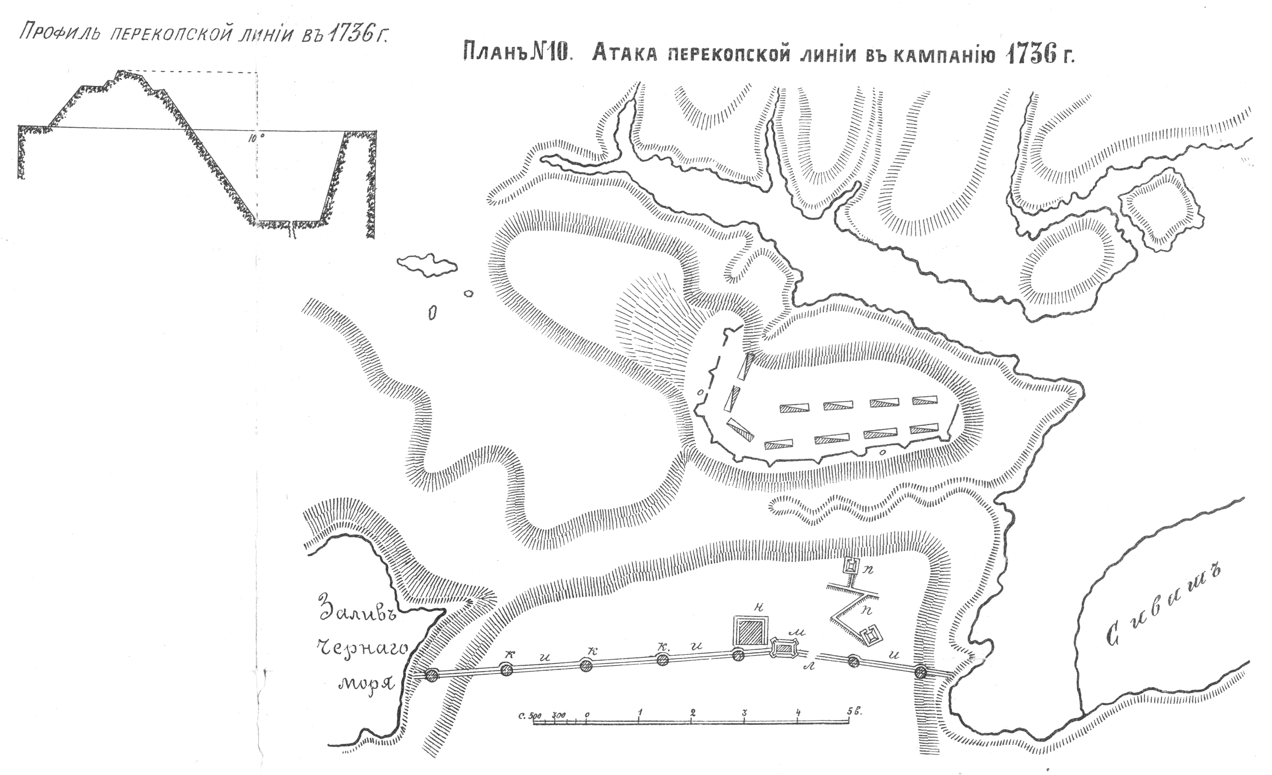 Перекопская линия, пересекавшая перешеек между Черным и Гнилым морями, имела в общем начертании вид тупого угла, обращенного вершиной к северу. Одна сторона этого угла, примыкавшая к Черному морю, имела 7 верст, а другая,— примыкавшая к Гнилому морю,—3 версты протяжения. В исходящем углу находились каменные ворота, составлявшие единственный проход на полуостров. Ворота эти были вооружены артиллерией, а непосредственно возле них лежала крепостца Ор-Кап. Она имела вид продолговатого четырехугольника с каменными стенами и бойницами у исходящих углов бастионов. Крепость Ор-Кап имела только одни ворота, обращенные к полуострову. Внутри нее находилось около 600 небольших домов. Гарнизон крепостцы состоял из янычар и снагов, в количестве всего около 4000 человек...