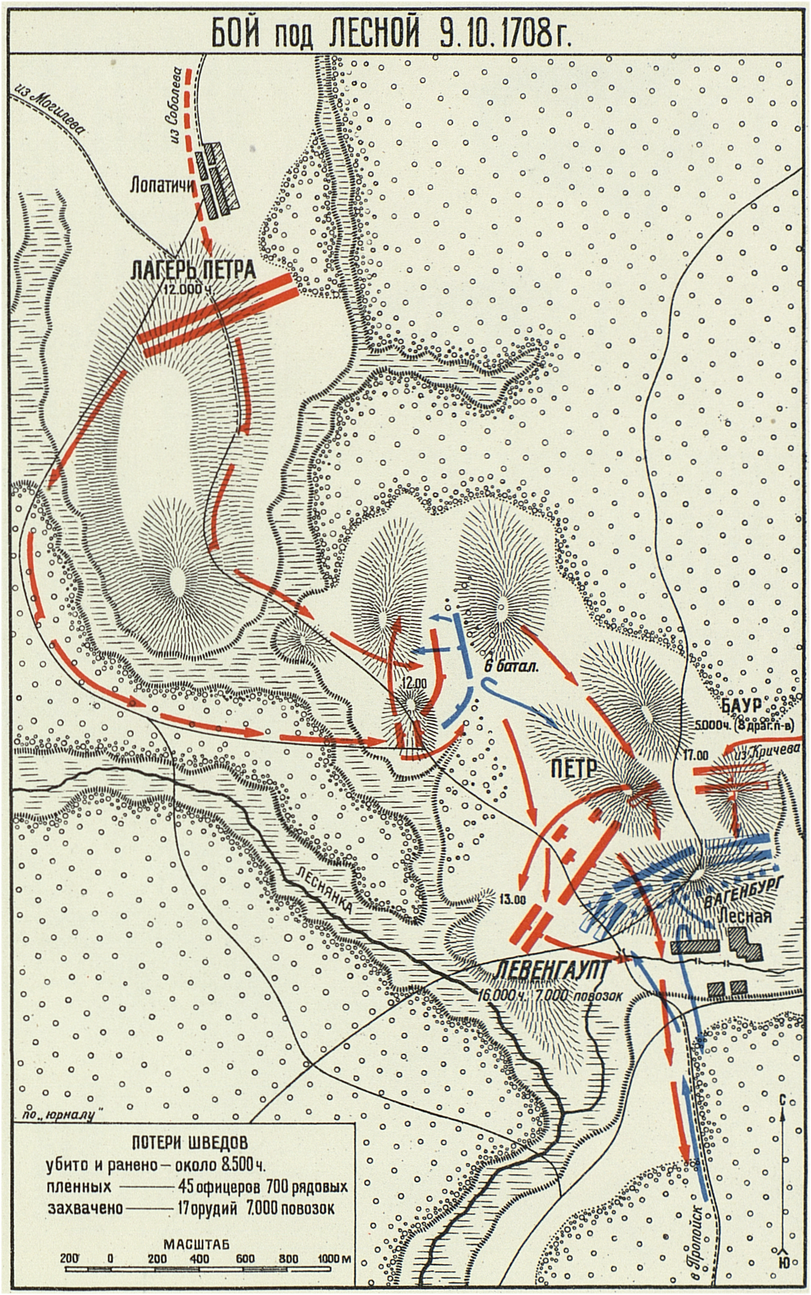 Лесная ―деревня в Могилевской обл. Белоруссии, в р-не к-рой 28 сент. (9 окт.) 1708 во время Северной войны 1700-21 произошло сражение между летучим отрядом (корволантом) рус. войск под команд. Петра I (ок. 5 т. ч. пехоты, ок. 7 т. кавалерии и несколько батарей) и швед. корпусом ген. А. Левенгаупта (ок. 16 т. ч., 17 орудий). На рассвете 28 сент. рус. корволант двинулся от д. Лопатичи двумя колоннами (по 5-6 тыс.) к Л. и отбросил швед. передовой отряд к гл. силам. Затем рус. войска атаковали гл. позицию шведов и после 2-час. ожесточенного боя вынудили противника отступить к вагенбургу. После подхода кавалерии Боура рус. войска начали атаку вагенбурга. Ок. 19 час. бой прекратился. Ночью Левенгаупт с остатками корпуса бежал к Пропойску. Преследуемые рус. кавалерией, шведы бросили обоз и отступили вниз по р. Сож. На соединение с гл. швед. силами прорвалось лишь ок. 6 т. ч. Шведы потеряли св. 9 т. ч., всю артиллерию и обоз. Рус. потери - св. 1 т. убитыми и ок. 3 т. ранеными. Победа при Л., к-рую Петр I назвал "матерью Полтавской баталии", лишила Карла XII крайне необходимых подкреплений, продовольствия и боеприпасов и фактически сорвала его план похода на Москву