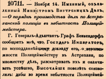 Г.Генерал-Адъютант Граф Бенкендорф сообщает мне, что Государь Император, по всеподданнейшему докладу его, о невозможности Полицмейстеру в Астрахани, по множеству дел, разсматривать их и оканчивать успешно, Высочайше повелеть соизволил: дабы во время небытности Полицмейстера в присутствии полиции, по исполнению других его обязанностей, по распорядительной части в городе, дела в полиции были оканчиваемы под председательством старшаго из членов