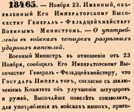 Военный Министр в отношении от 23 Ноября, сообщил Его Императорскому Высочеству Генерал-Фельдцейхмейстеру, что Государь Император, согласно с заключением Комитета об улучшении штуцеров и ружей, Высочайше повелеть соизволил, для употребления в войсках наших, приготовлять ударныя капсюли, четырех разрезныя по препровождаемому образцу.