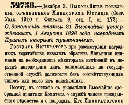 32758. — 16 декабря (3 декабря по ст.ст.). Высочайшее повеление, объявленное Министром Юстиции, 1909 год.О дополнении статьи 21 Высочайше утвержденных, 1 Августа 1898 года, наградных Правил вторым примечанием.Государь Император при рассмотрении наградных ходатайств изволил обратить Монаршее внимание на необходимость некоторых изменений в порядке награждения лиц, занимающих на государственной службе должности без соответствующих чинов или вовсе их не имеющих...