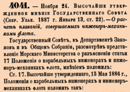 4041. 1886 год. 6 декабря (24 ноября ст.ст.) Высочайше утвержденное мнение Государственнаго Совета. О расчете плаваний, совершаемых инженер-механиками флота..Государственный Совет, в Департаменте Законов и в Общем Собрании, разсмотрев представление Морскаго Министерства о разъяснении статьи 127 Положения о корабельных инженерах и инженер-механиках флома, мнением положил <…> а) при определении общаго числа месяцев плавания в случаях, предусматриваемых статьями 13-15, 22 и 31 настоящаго Положения, каждые два дня заграничнаго плавания принимаются за один день внутренняго плавания <…>