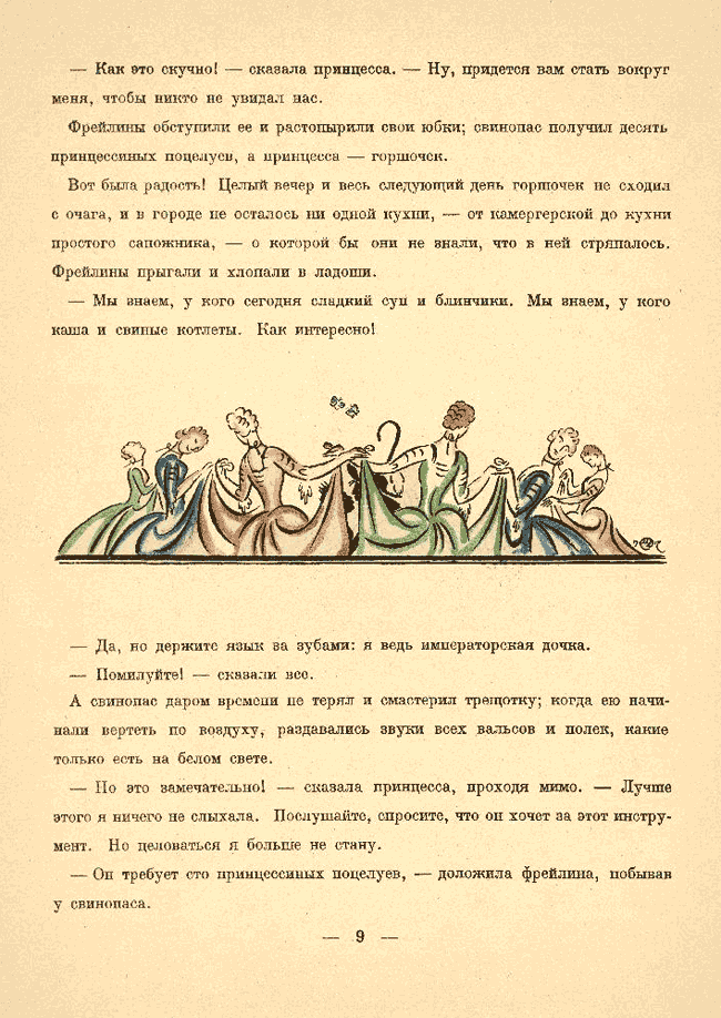 Фрейлины обступили ее и растопырили свои юбки; свинопас получил десять принцессиных поцелуев, а принцесса – горшочек. Иллюстрация в книге