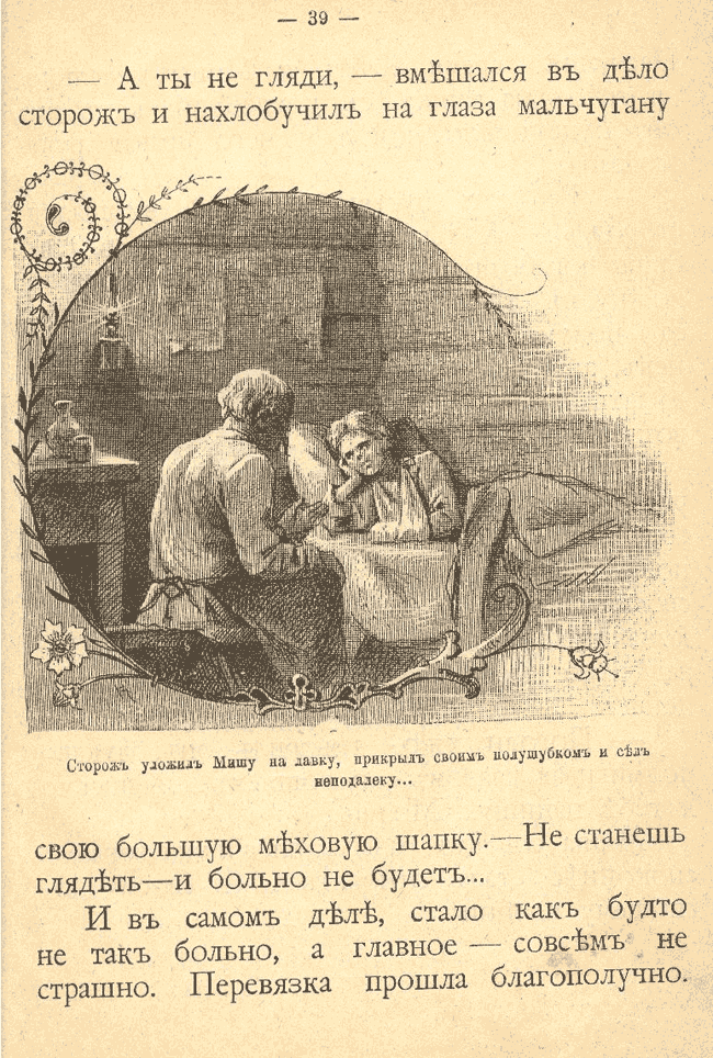 Сторож уложил Мишу на лавку, прикрыл своим полушубком и сел неподалеку… Иллюстрация в книге