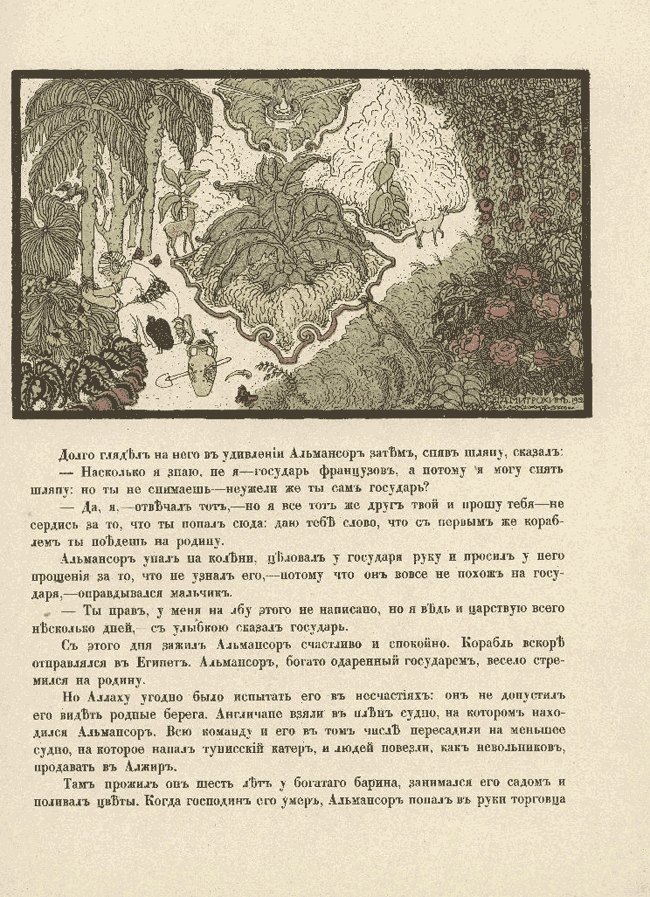 Альмансор прожил в Алжире шесть лет у богатого барина, занимался его садом и поливал цветы. Иллюстрация в книге