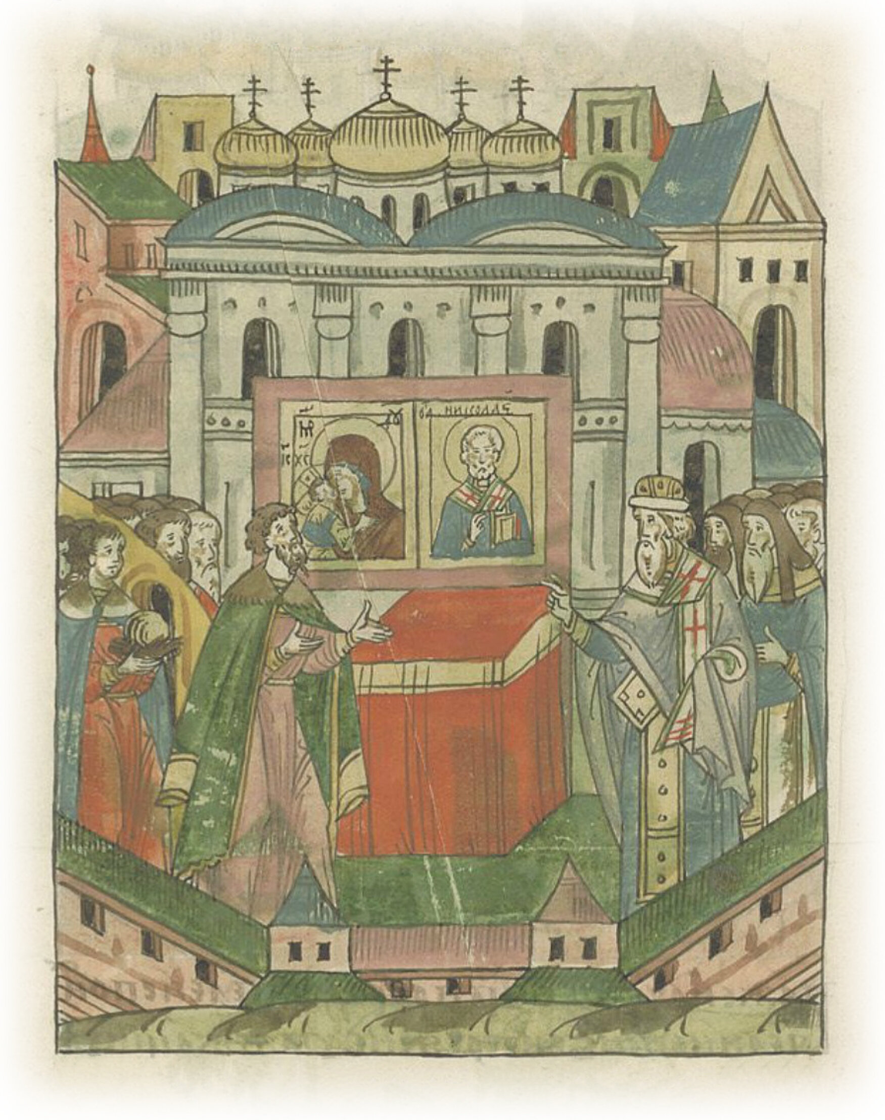 Великий князь Иван Васильевич совершает молебен в церкви Премудрости Божьей Святой Софии.