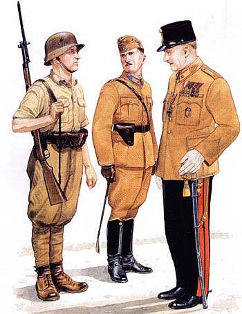 Слева — рядовой пехоты, лето 1942 г.; В центре — майор кавалерии, июль 1941 г.; Справа — генерал-майор в парадной форме, 1942 г.