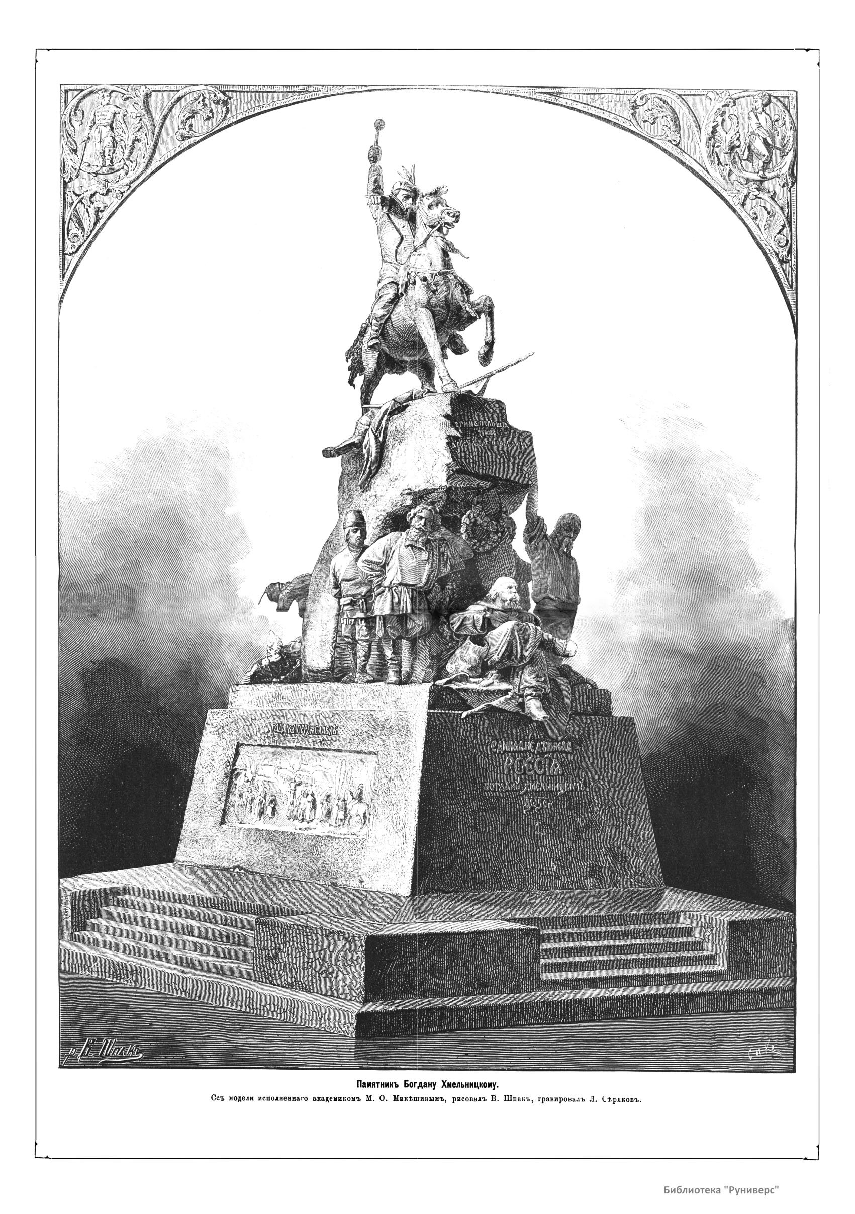 Новое произведение нашего высокоталантливого ваятеля запечатлено особенною мощью творчества — как в замысле, так и в исполнении. Славный малороссийский гетман, верхом на степном коне, грозно потрясая булавою, вскакал на вершину скалы; под ногами коня поверженная фигура — по-видимому иезуита; ниже на обрыве лепится сраженный шляхтич, в ужасе прикрывая голову от копыт промчавшегося коня; еще ниже, жид арендатор в страшных корчах испускает дух. Грозен и радостен «казацкий батько», свободною рукой он кажет вдаль (по проекту постановки памятника — на север) на Москву, как бы предвещая то важное событие, которое имеет совершиться в белокаменной собирательнице городов русских… Ныне Россия воздвигает памятник виновнику этого великого события, одному из славных страдальцев за Землю Русскую, на том месте, где Богдан произнес многознаменательные слова: «мы с православием Великой Руси едино тело церкви, имеющее главою Иисуса Христа».